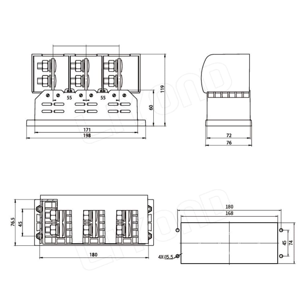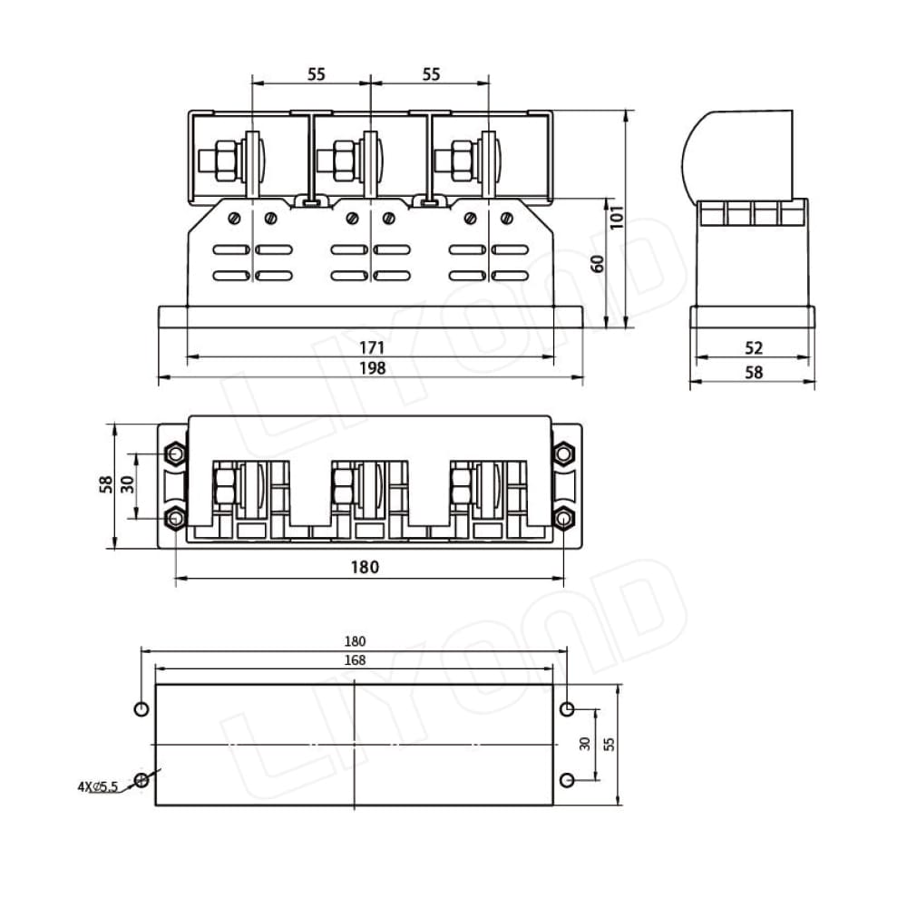 Чертёж трёхполюсных фиксированных контактов основного цепи XCT6-B-3-125A (250A, 400A)